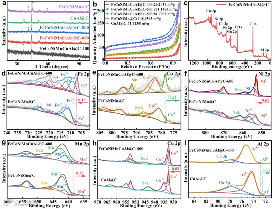 X射线衍射(XRD)显示FeCoNiMnCuAl@C-600为单相面心立方结构(FCC)。不同煅烧温度下得到的高熵合金会出现混相。FeCoNiMnCuAl@C-600显示出更大的比表面积和更丰富的多孔结构,这有利于吸附更多的CO2。同时通过X射线光电子能谱(XPS)证明了高熵合金的形成改变了材料中各金属元素的电子结构,并且电子密度的变化与金属元素的电负性大小相关。