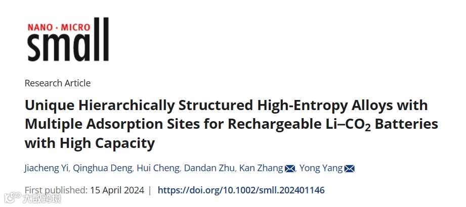 近日,来自南京理工大学的杨勇副教授与张侃教授合作,在国际知名期刊Small上发表题为“Unique Hierarchically Structured High-Entropy Alloys with Multiple Adsorption Sites for Rechargeable Li–CO2Batteries with High Capacity”的研究文章。该文章首次提出将废旧电池回收制备高熵合金,并首次将高熵合金应用于Li-CO2电池。同时通过密度泛函理论计算结合实验,深入了解了不同位点上CO2的吸附能力。本研究开启了HEAs在Li-CO2电池催化阴极中的应用,并为HEAs中吸附活性位点的研究提供了独特的见解。
