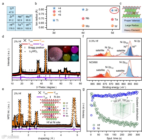Fig. 1. a) Sectional periodic table of elements. b) Comparison of ion radius between selective elements. c) Schematic diagram of Hf-doping and the trait of Hf element (Proper Valence, Large Radius and Heavy element). d, e) XRD and NPD Rietveld refinement of 2% Hf-doping cathode. SEM images of Hf-doping and the corresponding EDS mapping of Hf, Ni, Co, Mn are inset in d) and the schematic explaining of Hf-doping at Ni site is inset in e). f) XPS analysis of NCM90 and 0.3% Hf cathode in Ni 2p spectra. g) TOF-SIMS depth profiles of positive ion fragment on 0.3% Hf-doping cathode: Ni+ and Hf+. The 3D render of Hf+ is exhibited in the inset.
