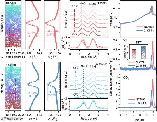 通过原位XRD以及原位XAS可知, Hf掺杂改性能缓解NCM90电极材料在充放电过程中的结构畸变。此外,通过DFT计算和DEMS表征可得,经过Hf元素改性后的正极材料因晶格氧的在高电压下不稳定所释放的氧气量明显减少,这得益于更强的Hf-O键能。