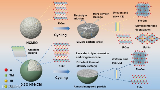 图1. Hf掺杂改性NCM90正极的机理示意图。