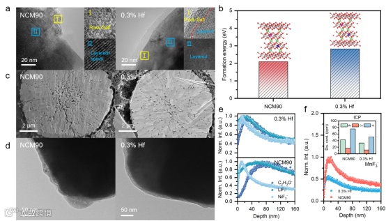 Fig. 4. NCM90 and 0.3% Hf electrodes cycled at 1C in the voltage range of 3.0∼4.3 V after 100 cycles: a) HRTEM images, c) Cross-sectional morphology and d) TEM images. b) The Li/Ni exchange formation energy of NCM90 and Hf-doping at delithiated state (∼Li0.33). e, f) TOF-SIMS sputtering depth curves (normalized based on maximum intensity) of the composition (C2H3O−, LiF2−, NiF3− and MnF3−) on the NCM90 and 0.3% Hf cathode surface after cycling. The inset Figure in f is the dissolving amount of Ni/Co/Mn collected on lithium metal anode after 100 cycles.