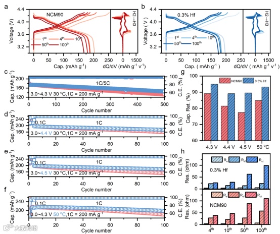 Fig. 2. a, b) Charge-discharge curves evolution (on the left side) and the corresponding dQ/dV profiles (on the right side) of NCM90 and 0.3% Hf-doping cathodes in the voltage range from 3.0 to 4.3 V with a current density of 200 mA g−1 at 30 °C. c) Cycling performance at 1C (1C = 200 mA g−1) for charge and 5C for discharge. Cycling stability at harsh conditions of d) 4.4 V, e) 4.5 V and f) 50 °C. g) Cycling performance comparisons between NCM90 and 0.3% Hf-doping cathodes at different conditions. h) EIS fitted impedance values (Re, Rsf, Rct) of NCM90 and 0.3% Hf cathodes during cycling.