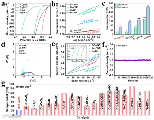 Fig. 4. (a) HER polarization curves and (b) corresponding Tafel plots of different catalysts, (c) comparison of overpotentials for all catalysts, (d) EIS curves and (e) Cdl and the HER polarization curves normalized by ECSA of different catalysts, (f) i-t curves of P-Co/NF at −0.890 V, (g) comparison of overpotentials of P-Co/NF with recently reported Co based HER catalysts.