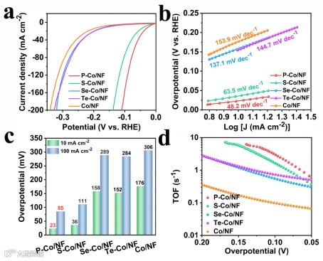 Fig. 3. (a) LSV curves, (b) Tafel plots, (c) comparison of overpotentials, (d) TOF values of P-Co/NF, S-Co/NF, Se-Co/NF, Te-Co/NF and Co/NF.