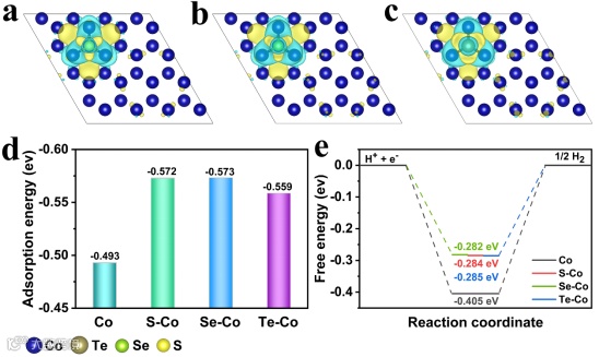 Fig. 6. Differential charge density of (a) S-Co, (b) Se-Co and (c) Te-Co, (d) ΔE of H2O, (e) ΔGH* of H* of Co, S-Co, Se-Co and Te-Co, respectively. Yellow and cyan isosurfaces represent electron accumulation and electron depletion, respectively.