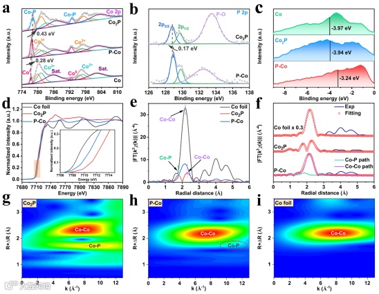 Fig. 2. (a) Co 2p, (b) P 2p and (c) normalized valence band spectra of Co2P, P-Co and Co. (d) Co K-edge XANES and (e) FT-EXAFS spectra of Co foil, Co2Pand P-Co and (f) their fitting results in R-space. Wavelet transforms for the k3-weighted Co K-edge EXAFS signals of (g) Co2P, (h) P-Co and (i) Co foil.