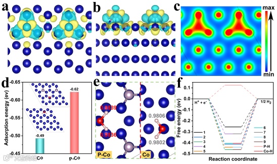 Fig. 5. (a, b) Differential charge density of P-Co (Yellow isosurfaces, electron accumulation; cyan isosurfaces, electron depletion.), (c) the charge density contour plot of the P-Co, (d) adsorption energy of H2Oon Co and P-Co, (e) the length of O−H bond in the optimized H2Oadsorption model of P-Co and Co, (f) ΔGH* on different sites of Co and P-Co. Color code: blue, Co; gray, P; red, O; white, H.