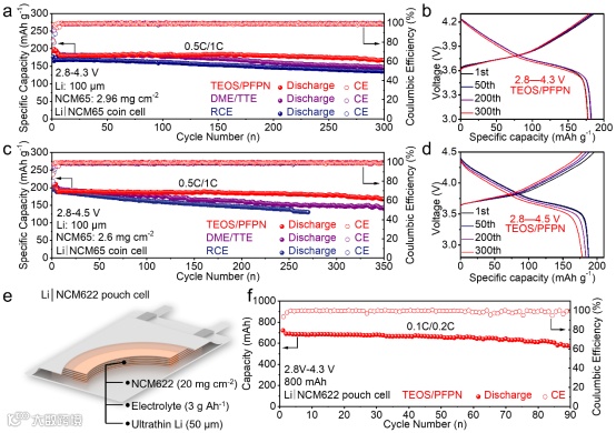 使用TEOS/PFPN的Li/NCM65全电池在4.3和4.5 V的电压窗口内均可稳定循环超过300圈。组装的800 mAh Li/NCM622软包电池可循环90圈以上,且容量保持率超过80%,表明TEOS/PFPN具有一定的应用潜力。