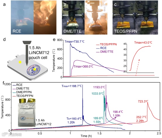 该活性锂钝化型电解液在延迟锂金属电池热失控方面表现优异,又因其与锂金属负极和三元正极保持良好兼容性而潜力突出,可为热失控预警提供更充足的时间。而且该电解液具有的不可燃性,可有效防止火灾蔓延。我们相信这项研究成果为锂金属电池安全电解液的设计开辟了新途径,将对高安全锂金属电池领域的发展产生推动作用。