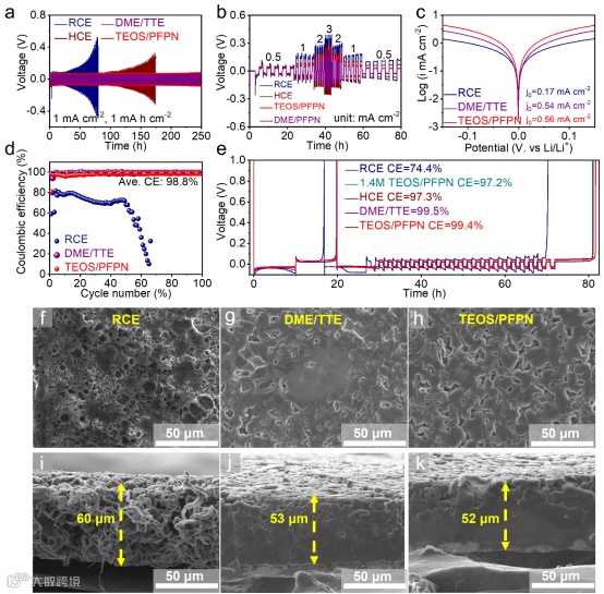 采用TEOS/PFPN 的Li | Li对称电池以及Li-Cu电池所展现的循环,倍率性能、交换电流密度以及计算和实测库伦效率远由于RCE,并与DME/TTE相差无几。此外,在TEOS/PFPN中沉积的锂金属呈紧密堆叠的大颗粒,表明TEOS/PFPN具有较好的Li+ 传输动力学和耐用性,同时和锂金属负极保持良好的兼容性。