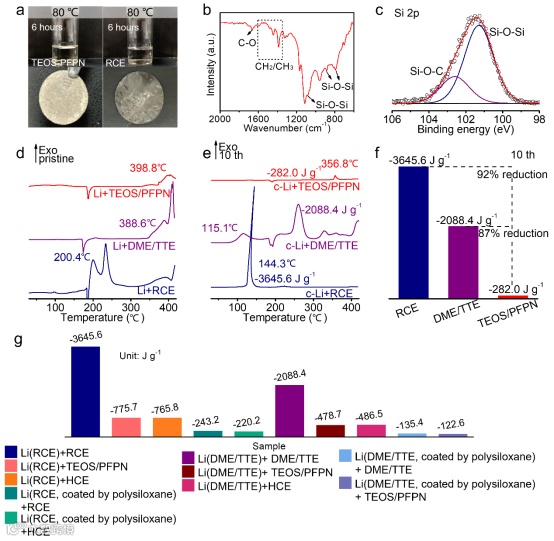 浸泡在TEOS/PFPN中的金属锂,表面可形成明显的聚硅氧烷钝化层。与RCE和DME/TTE相比,初始金属锂与TEOS/PFPN的起始放热温度最高。循环后的锂负极与TEOS/PFPN放热量最小,表明其可有效钝化活性锂,抑制与电解液的放热副反应。