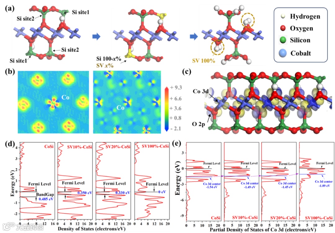 线性扫描伏安法(LSV)测得电极材料催化OER反应的过电位。在10 mA·cm-2的电流密度下,而SV-CoSi的过电位相对于CoSi(408 mV)大幅降低至 301 mV。塔菲尔斜率的计算显示了SV-CoSi更好的反应动力学,而电活性表面积(ECSA)表明SV-CoSi相对CoSi具有更多的活性位点。此外,SV-CoSi的循环稳定性较为出色,证明结构调控不会导致骨架的坍塌。DFT计算证实了相对于CoSi,SV-CoSi中钴元素的电子云密度明显降低,带隙变窄,这与表征与测试的结论一致,且随着空位浓度增加,费米能级逐渐接近Co元素的3d轨道的中心,使Co-O键共价性增强,稳定了关键中间体。