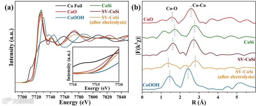 首先,硅空位的增加显然会导致样品中元素比例的变化,无论是ICP,EDS mapping,和XPS的元素分析都证明了SV-CoSi中的钴硅元素的比例要高于CoSi,对应SV-CoSi结构中硅空位的产生。其次,红外光谱中的Si-OH吸收峰和热重曲线中特殊的吸热区间证明了Si-OH结构的存在,对应着硅空位处氧被氢的饱和。然后,UV-vis和XPS中的峰位移,以及XPS中的峰面积比的变化都证明了SV-CoSi电子云密度相对CoSi的降低,也可以间接地证明此结构。XAFS反映出SV-CoSi相对CoSi的Co-O,以及Co-Co键长变化也证实了硅酸根空位的存在。