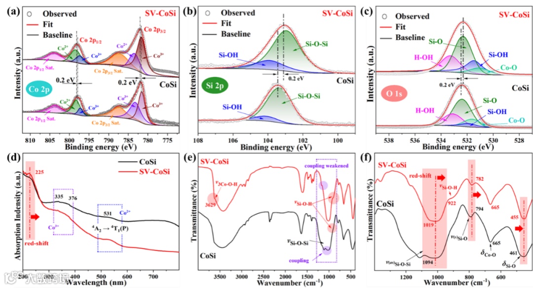 图3 CoSi和SV-CoSi的结构表征(XPS、UV-vis、FTIR)