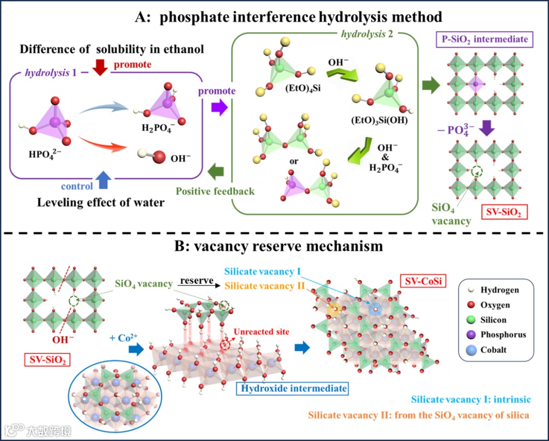 我们先合成有硅空位的二氧化硅,再通过自模板法合成有硅空位的硅酸钴。首先,我们发现并确认了在合成二氧化硅的过程中加入磷酸盐可以诱导二氧化硅的硅空位产生,由于反应物和生成物在水和乙醇中溶解情况存在差异,因此水醇比可以控制磷酸一氢根的水解速率,从而控制整个水解反应的速率。水解过程中磷酸根由于与硅氧四面体结合不稳定而脱去,最终生成具有硅空位的二氧化硅,命名为SV-SiO2。接下来,以SV-SiO2为模板,通过牺牲模板法合成了有阴离子缺陷的硅酸钴SV-CoSi,,在这种机理中,SV-SiO2中存在的硅空位会随着其刻蚀得到的阴离子团中间体保留至产物硅酸钴SV-CoSi当中。