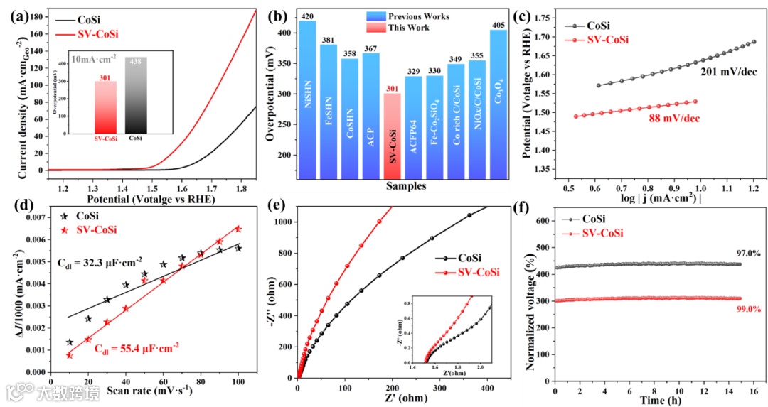图1. SV-CoSi的合成路径、结构及其应用于OER电催化对性能提升。