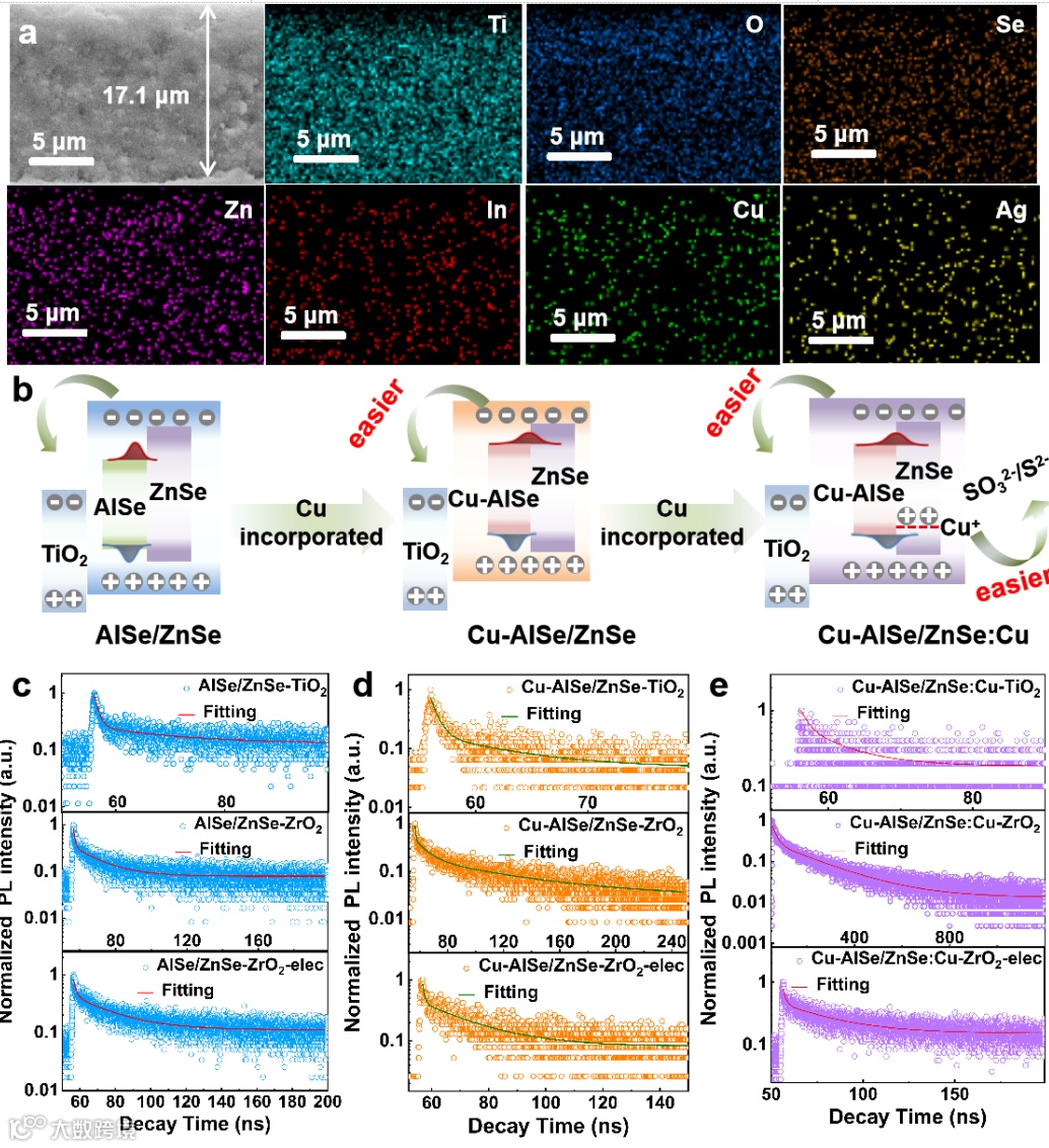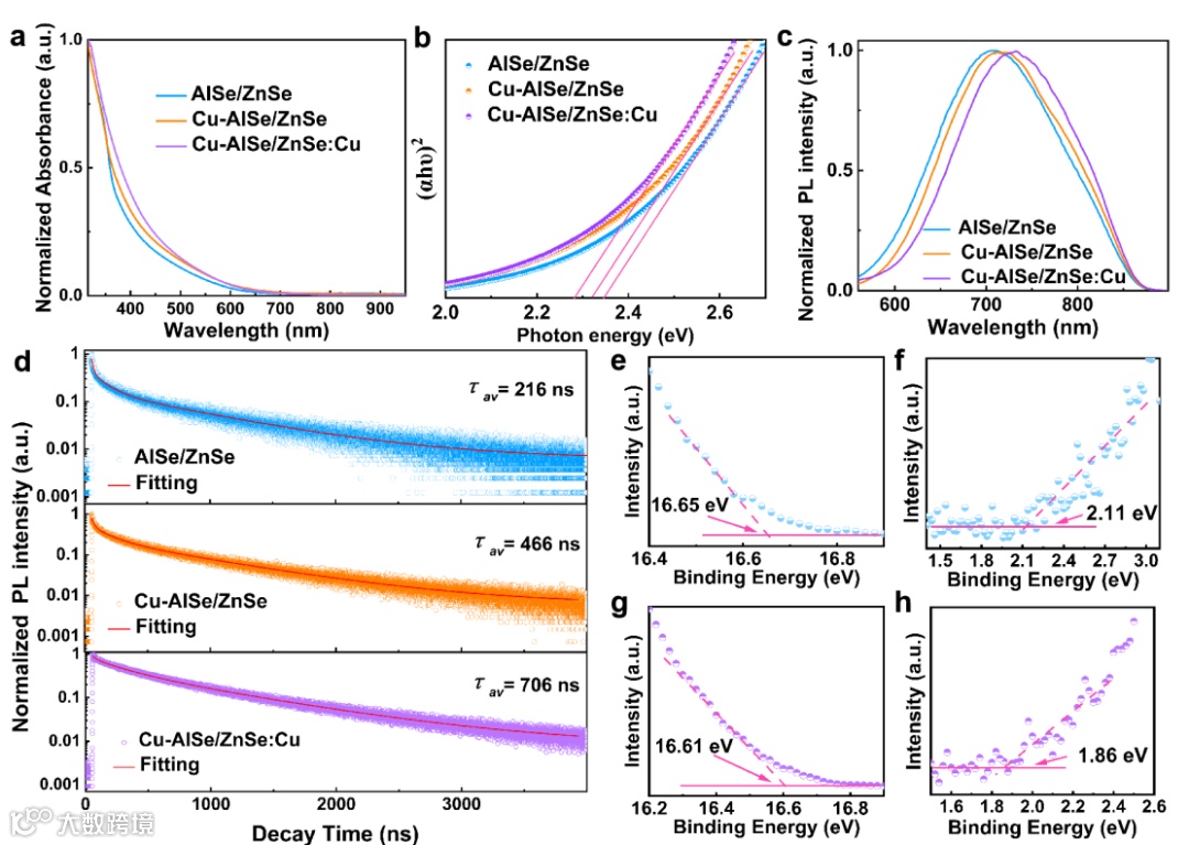 图2 量子点光电特性研究:Cu引入核量子点中,引起了Cu杂质能级发射和电子离域,实现了激子寿命延长。当Cu进一步引入到Cu-AISe/ZnSe量子点的壳层中时,由于壳层中的Cu+态捕获了来自核量子点的光生空穴,从而实现了更有效的电子-空穴分离。