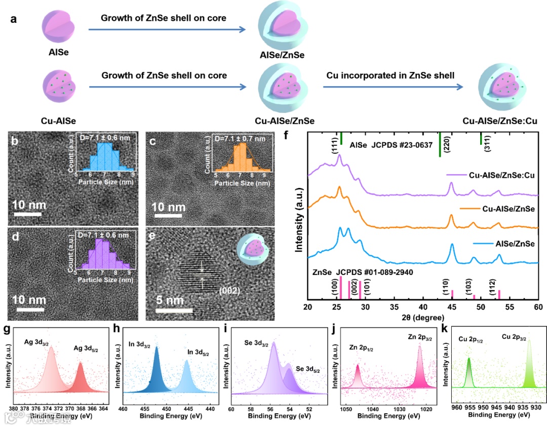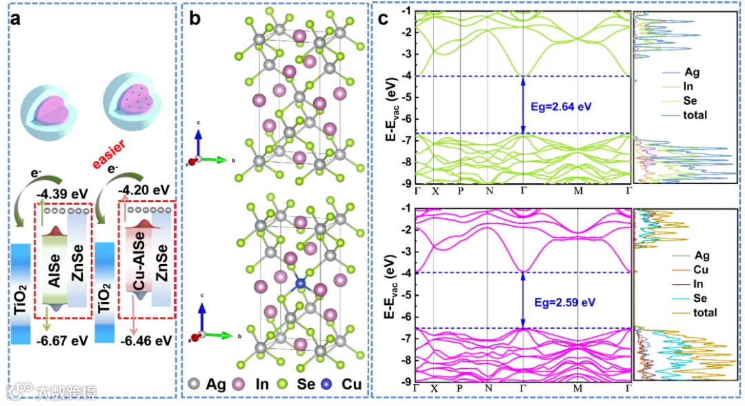 图3量子点能带结构计算:理论计算进一步研究表明,Cu引入到AISe核中可以使得其导带相对ZnSe向上移动。