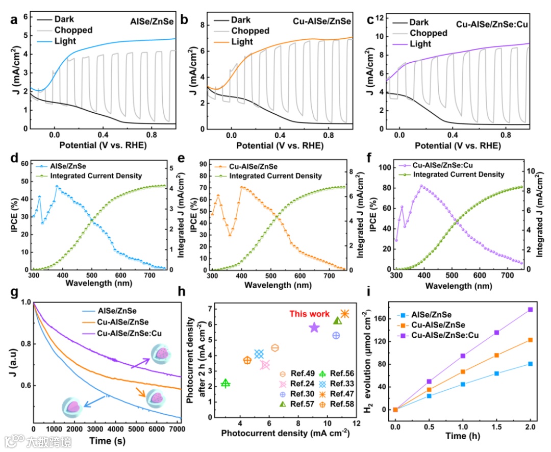 图5 量子点光电化学电池性能:核壳同时引入Cu可以使量子点光电化学电池制氢性能大幅提高。此外,由于引入Cu可以优化量子点能带结构和光生载流子动力学,对应量子点光电极的析氢速率也得到了进一步提升。
