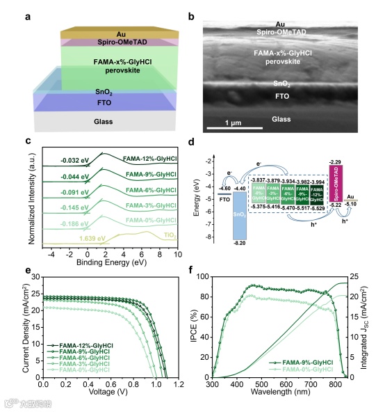 图3 器件结构与光电性能。(a) 结构示意图和 (b) Glass/FTO/SnO2/FAMA-x%-GlyHCl钙钛矿/Spiro-OMeTAD/80 nm Au (x=0、3、6、9和12)构型的钙钛矿横截面扫描电子显微镜SEM图像; (c) 价带XPS谱和 (d) 相应的能级排列图; (e) 基于Fama-x%-GlyHCl的PSCs的J-V图; (f) FAMA-x%-GlyHCl (x=0和9)基PSCs的IPCE谱。