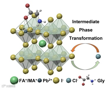 近日,南京大学金钟教授团队在国际知名期刊Nano Research上发表题为”Multifunctional Dual-Anion Compensation of Amphoteric Glycine Hydrochloride Enabled Highly Stable Perovskite Solar Cells with Prolonged Carrier Lifetime”的观点论文。该文提出一种新的方法,利用甘氨酸盐酸盐(GlyHCl)作为第二步制备FA0.9MA0.1PbI3(FAMA)钙钛矿薄膜的两性添加剂。甘氨酸具有Cl-和-COO-双阴离子,其中Cl-可诱导形成中间红色过渡相,再转化为α相钙钛矿结构。在退火过程中,氯离子与质子结合,以氯化氢气体的形式蒸发。GlyHCl中的-COO-基团作为Lewis碱与Pb2+配位,以减少钙钛矿晶格中的缺陷。结果表明,以FAMA-9%-GlyHCl为基础的PSCs的光电转换效率最高,达到19.40%。此外,经修饰处理的钙钛矿吸光材料在环境和热条件下表现出良好的长期运行寿命和湿热稳定性。这些结果归因于两性GlyHCl添加剂中Cl-和-COO-对钙钛矿材料中空位的多向补偿,使其具有更好的结晶度、更强的光吸收、更长的载流子寿命和更好的界面稳定性。这项工作通过晶格掺杂和界面工程的协同效应有效抑制了表面缺陷和界面缺陷,为高质量钙钛矿材料的制备提出了新的见解和启发。