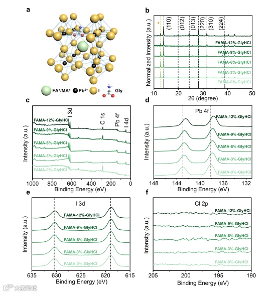 图1. 钙钛矿薄膜结构与组成分析。(a) 钙钛矿FAMA-x%-GlyHCl (x=0,3,6,9和12)的晶体结构示意图;(b) XRD图谱(标有‘*’的峰来自PbI2); (c) FAMA-x%-GlyHCl钙钛矿薄膜的XPS全谱和相应元素 (d) Pb 4f; (e) I 3d; (f) Cl 2p的高分辨率XPS谱。