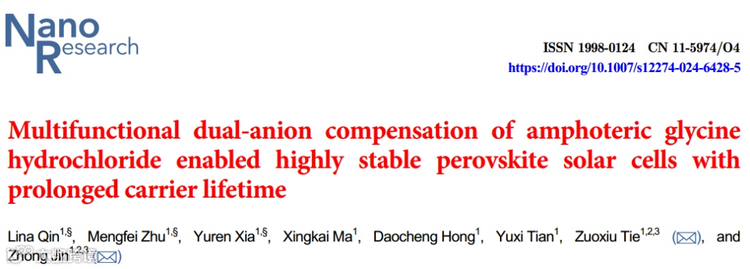 Multifunctional Dual-Anion Compensation of Amphoteric Glycine Hydrochloride Enabled Highly Stable Perovskite Solar Cells with Prolonged Carrier Lifetime. Nano Research, 2024,