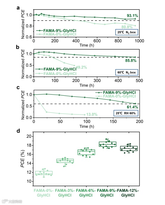 图4器件湿热稳定性与重复性。(a) 常温下在充氮手套箱中保存的FAMA-x%-GlyHCl (x=0和9)基钙钛矿的PCE转换效率稳定性测试;(b) 将FAMA-x%-GlyHCl (x=0和9)基钙钛矿在60℃连续加热下保存在充氮手套箱中的PCE转换效率稳定性测试; (c) 将FAMA-x%-GlyHCl (x=0和9)基钙钛矿暴露于相对湿度为60%的潮湿空气中的PCE转换效率稳定性测试; (d) 基于12个FAMA-x%-GlyHCl (x=0、3、6、9和12)的PSC的PCE分布图。