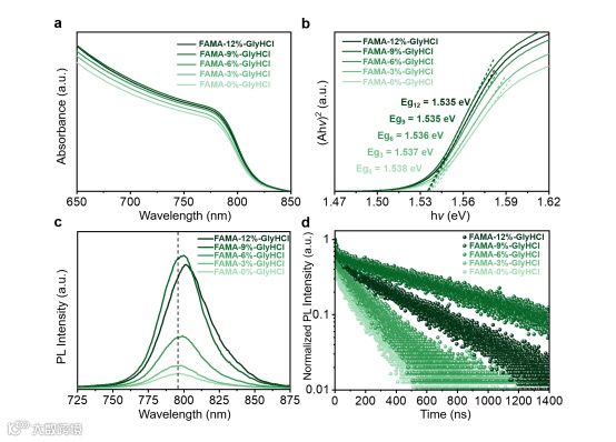 图2 所制备的钙钛矿薄膜光响应特性。(a) UV-Vis吸收光谱; (b) 相应的(Ahv)2-hv曲线; (c) 稳态荧光光谱和 (d) FAMA-x%-GlyHCl (x=0,3,6,9和12)钙钛矿薄膜的TRPL光谱。