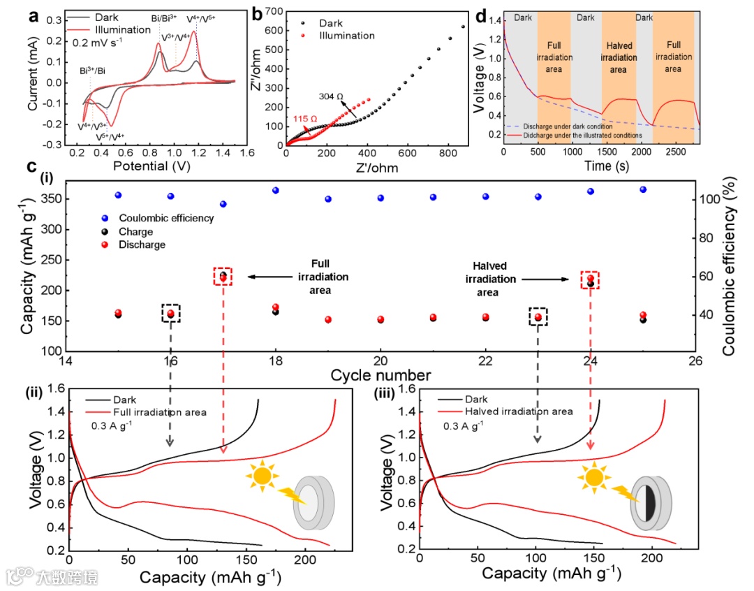 光辅助离子电池不仅具备传统离子电池的功能,在光照条件下,还能显著提升电池容量、降低充电电压、提高放电电压、促进离子传输等,在未来储能应用中展现了巨大潜力。然而由于叠层电池的结构紧凑,可用于光照的面积十分有限,克服光照面积的尺寸限制是推动光辅助离子电池发展的关键。