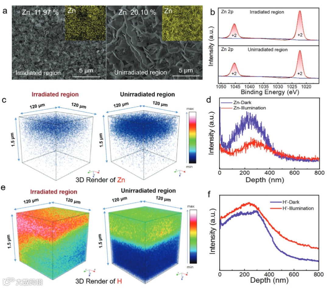 利用SEM mapping和飞行时间二次离子质谱仪(TOF-SIMS)对比同一电极上光照区域与非光照区域的成分发现,光照区域倾向于氢离子嵌入(可能由于光诱导质子嵌入),而非光照区域倾向于额外的锌离子嵌入。