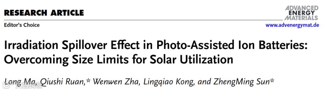 近日,东南大学孙正明、阮秋实团队,在国际知名期刊Advanced Energy Materials上发表题为“Irradiation Spillover Effect in Photo-Assisted Ion Batteries: Overcoming Size Limits for Solar Utilization”的文章。该研究揭示了光辅助离子电池中的“光溢出效应”,克服了光辅助离子电池中光照面积的尺寸限制。