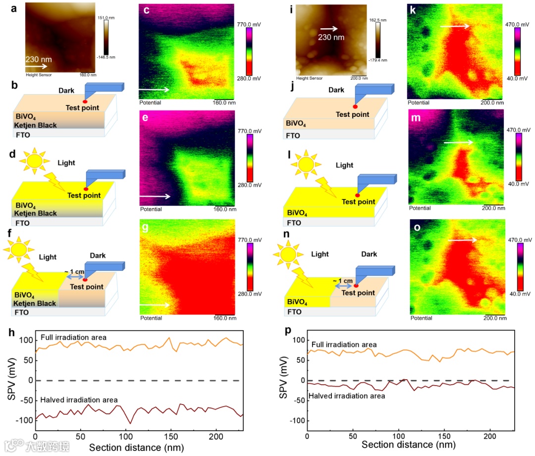 利用开尔文探针(KPFM)去检测同一电极上光照区域和非光照区域的表面电势发现,BiVO4/Ketjenblack电极与BiVO4电极在光照区域均展现出+100 mV的表面电势变化,这源于BiVO4的n型半导体性质,然而,BiVO4/Ketjenblack电极在非光照区域显示出接近-100mV的表面电势变化,而BiVO4电极在非光照区域的电势不变。这说明BiVO4/Ketjenblack电极中的光生电子从光照区域流向了非光照区域,因此形成了内部电位差,而Ketjenblack的存在大大提升了光生电子的迁移距离,因此展现出“光溢出效应”。