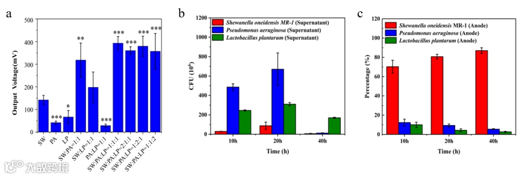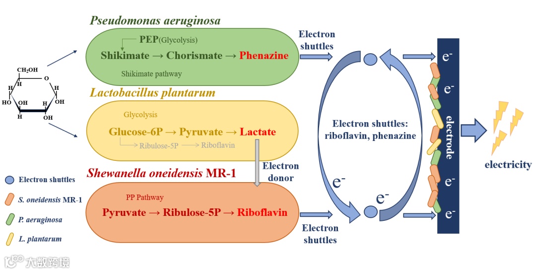 混合微生物燃料电池由于物种间的协同作用,其输出功率往往优于单一菌种燃料电池。通过工艺优化,以产电模式菌希瓦菌(Shewanella oneidensis MR-1)、铜绿假单胞菌(Pseudomonas aeruginosa)和植物乳杆菌(Lactobacillus plantarum)为基础,合理设计合成三种菌联盟体系,在以葡萄糖为底物的MFC中,三种菌种联盟体系的最大功率密度为~207 mW/m2,比单一菌种接种的MFC提高了2~58倍。此外,该合成联盟系统可以利用广谱底物(乳糖、蔗糖、麦芽糖、阿拉伯糖、纤维素二糖)发电,并且具有较好的产电性能。电化学和代谢分析表明,这种合成联盟系统在电荷转移、底物利用和生物膜形成方面的协同增强是MFC性能提高的潜在机制。在该体系中,L. plantarum利用葡萄糖产生乳酸作为S. oneidensis MR-1的产电底物和电子供体,P. aeruginosa利用葡萄糖产生另一种电子穿梭体吩嗪类物质,也可以促进S. oneidensis MR-1生物膜的生长,帮助联盟系统更好地传递电子。本研究展示了一种通过合理设计的合成细菌群落来提高MFC性能的新策略,这将进一步成为更新MFC的优化工具箱。