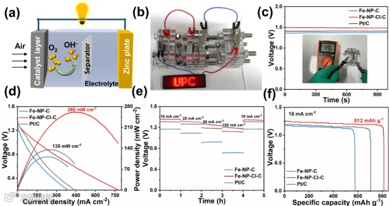 通过盐效应调控的催化剂具有优异ORR活性,在碱性电解液中半波电位为0.92 V (V vs. RHE)。不同种类的盐所导致的盐效应均对催化剂氧还原性能其促进影响,其中NaCl由于具有最强的盐效应,所制备的催化剂ORR性能最好,优于大多数所报道的氧电催化剂。得益于Fe-NP-Cl-C优异的ORR性能,作为锌-空气电池空气电极,峰值功率密度达260 mW cm-2和812 mAh g-1的高比容量。