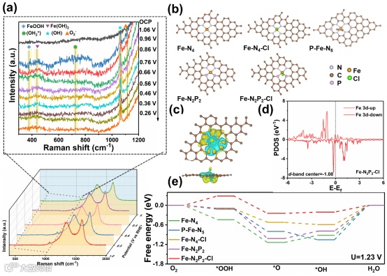 利用原位拉曼分析证明Fe-N2P2-Cl是ORR主要的活性位点。DFT理论模拟计算表明,P配位原子对Fe中心有供电子作用而轴向的Cl配位原子则发挥拉电子作用,在P和Cl的协同调控作用下,Fe-N2P2-Cl活性中心的电荷分布得到优化,Fe-N2P2-Cl活性中心Fe电荷为-0.8 e,d带中心偏移至-1.08,有利于ORR中间体的吸附和转化,尤其是Fe-N2P2-Cl对*OH还原步骤的反应垒降至0.21 eV,明显低于Fe-N4和其他配位结构,高效促进ORR反应过程的顺利进行。