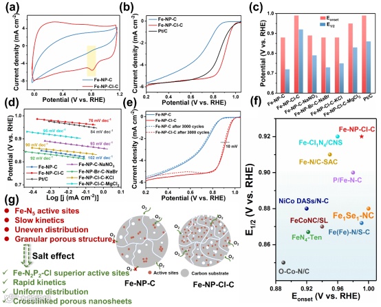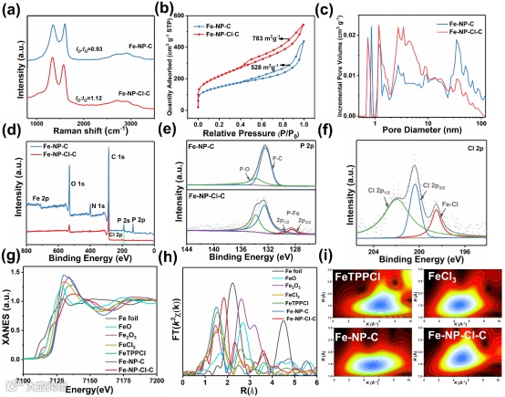 盐效应诱导合成的催化剂Fe-NP-Cl-C具有更高的缺陷,更大的比表面积。盐的引入改变了Fe的配位环境,XPS的高分辨证明Fe-NP-Cl-C中P 2p存在P-Fe键,Cl 2p存在Cl-Fe键。Fe-NP-Cl-C的近边吸收谱显示Fe k边位于FeO和Fe2O3之间,表明Fe处于氧化态。傅里叶变换扩展的X射线吸收精细结构显示Fe-NP-C和Fe-NP-Cl-C在1.5 Å的特征峰与Fe-N相对应,而Fe-NP-Cl-C在1.8 Å的额外强特征峰由Fe-P (1.9 Å)和Fe-Cl (1.7 Å)复合形成。通过进一步拟合EXAFS光谱得到Fe-NP-Cl-C的配位结构为Fe-N2P2-Cl,而未引入盐效应的Fe-NP-C的配位结构为Fe-N5。