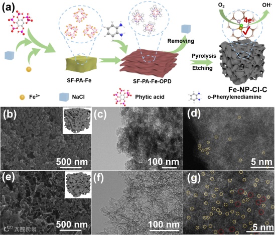 本文利用NaCl所引发的盐效应调节植酸(PA)的电离平衡,增强PA与Fe前驱体的螯合作用,调控优化碳载体的微观形貌和单原子Fe的配位环境。对催化剂进行形貌分析发现,未引入盐效应所合成的Fe-NP-C催化剂表现为颗粒孔状分布,存在碳层堆积结构,金属单原子Fe分散不均匀。而基于盐效应诱导合成的Fe-NP-Cl-C催化剂表现为多孔交联纳米片结构,单原子Fe均匀地分布于碳基底上。以上结果表明,盐效应对催化剂的结构具有显著地调控作用,促进Fe单原子的均匀分散与落位,强化活性位的暴露和传质扩散。