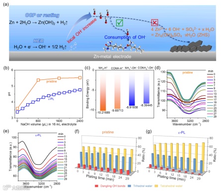 Figure 1. a) Schematic illustration of ZHS formation pathways and how ɛ-PL balances local pH environment. b) Titration of pristine (orange line) and ɛ-PL electrolyte (blue line) with 0.1 M NaOH. c) The binding energy of protonation and deprotonation of amino and amide groups of ɛ-PL. d, e) In situ ATR-SEIRAS spectra of the pristine electrolyte and ɛ-PL electrolyte. f, g) Area ratios of fitting tetrahedral-coordinated H2O (yellow cylinder), trihedral-coordinated H2O (blue cylinder), and dangling O─H bonds (red cylinder) of interfacial H2O at the Zn/electrolyte interface assembled with (f) pristine electrolyte, and (g) ɛ-PL electrolyte.