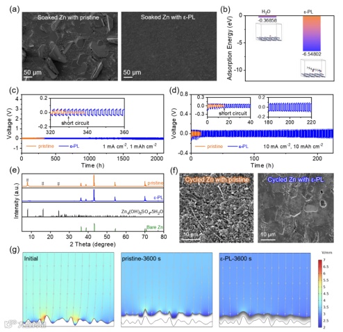 Figure 3. a) SEM images of Zn immersed in pristine (left side) and ɛ-PL electrolytes (right side) for 7 days, respectively. b) Absorption energy of H2O and protonated ɛ-PL on Zn (101) surface. c, d) Cycling performance of Zn-Zn symmetric cells assembled with pristine (orange line) and ɛ-PL electrolyte (blue line) cycled at c) 1 mA cm−2/1 mAh cm−2, and d) 10 mA cm−2/10mAh cm−2, respectively. e, f) XRD patterns and corresponding SEM images of cycled Zn electrode operated at 1 mA cm−2 for 50 h. g) Finite element simulation of electric field distribution at the Zn/electrolyte interface assembled with pristine (middle) and ɛ-PL electrolyte (right) after electro-plating for 3600 s.