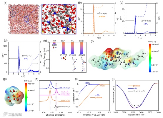 Figure 2. a) 3D snapshot of solvation shell of Zn2+ of bulk ɛ-PL electrolyte obtained from MD simulations. b–d) RDFs and corresponding coordination numbers of (b) Zn2+-O (H2O) of pristine electrolyte, c) Zn2+-O (H2O), and (d) Zn2+-O (ɛ-PL) of ɛ-PL electrolyte, respectively. e) Binding energy of Zn2+-H2O, Zn2+-SO42-, Zn2+-NH2, andZn2+-CONH pairs calculated by DFT. f, g) Electrostatic potential maps of (f) Zn2+−3H2O-SO42−-ɛ-PL solvation structures and (g) pristine Zn2+−5H2O-SO42−, respectively. h) 1H NMR spectra of pristine (orange line), pure 1.5 wt% ɛ-PL powder dissolved in D2O (pink line), and ɛ-PL electrolyte (1.5 wt% dissolved in pristine electrolyte, blue line). i) Hydrogen evolution reaction (HER) curve of Zn/SS cell assembled with pristine and ɛ-PL electrolyte tested via LSV at a scan rate of 1 mV s−1. j) Comparison of IR curves with different electrolytes.