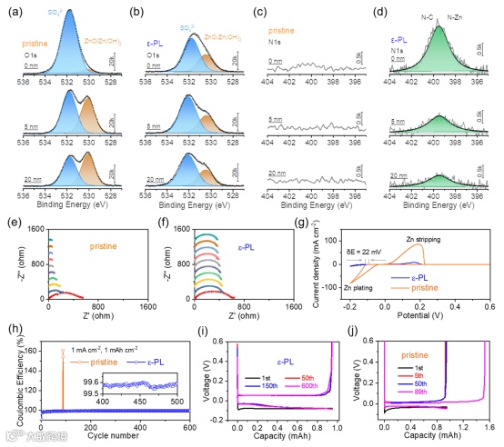 Figure 4. a–d) Depth-resolved XPS spectra of cycled Zn surface after cycling at 1 mA cm−2 for 20 h, (a, b) O1s and (c, d) N1s of cycled Zn electrode assembled with pristine and ɛ-PL electrolyte, respectively. e, f) In situ EIS of Zn-Zn symmetric cells assembled with (e) pristine and (f) ɛ-PL electrolyte. g) CV curves of Zn-Cu asymmetric cells assembled with pristine (orange line) and ɛ-PL electrolyte (blue line). h) CE of Zn-Cu cells cycled at a current density of 1 mA cm−2 and a fixed capacity of 1 mAh cm−2, i, j) Capacity-voltage profiles of Zn-Cu cells assembled with (i) ɛ-PL electrolyte and (j) pristine electrolyte.