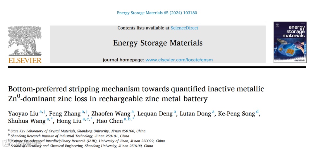 近日,山东大学陈皓、刘宏、王书华教授课题组,在国际知名期刊Energy Storage Materials上发表题为“Bottom-preferred Stripping Mechanism Towards Quantified Inactive Metallic Zn0-Dominant Zinc Loss in Rechargeable Zinc Metal Battery”的文章。该文章开发了一种酸辅助连续滴定收集气相色谱技术(AAC-TCGC),该技术可以准确量化负极中非活性Zn0和ECSR的量,并发现非活性Zn0占锌损失的大部分,而不是电化学副反应衍生的ECSR。