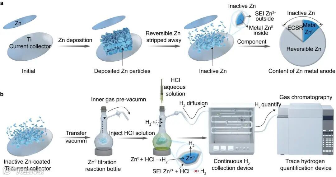 图1.非活性Zn的形成机制和AAC-TCGC测试过程。(a)Zn||Ti半电池镀锌/脱锌循环中非活性金属Zn0和ECSR在非活性锌损失中的形成机制。(b)AAC-TCGC测试过程,用于精确的非活性金属Zn0定量。
