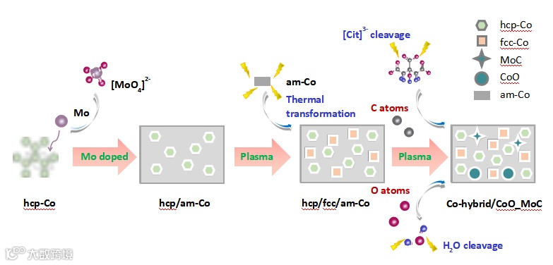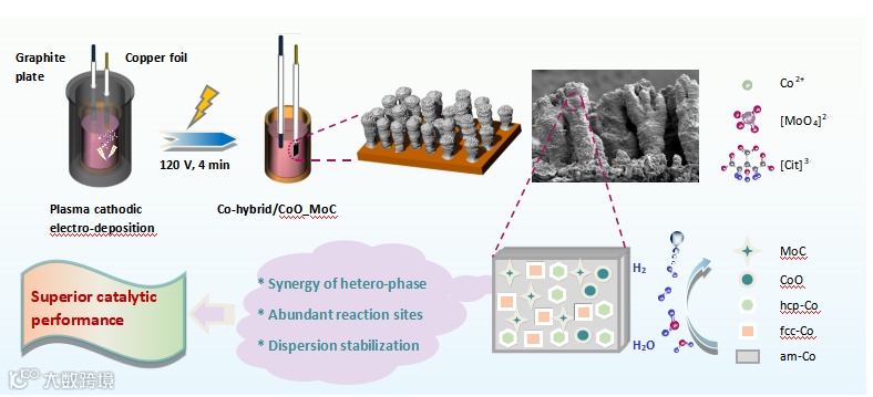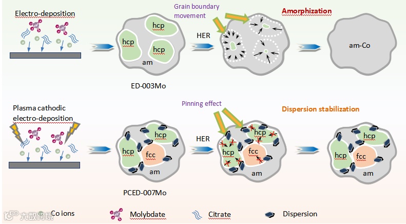在等离子体电沉积技术下,等离子体放电的热效应分解电解质,产生大量活性碳、氧原子,与沉积的金属原位结合,形成细小弥散的CoO、MoC等第二相颗粒,这些颗粒与钴的亚稳相结合牢固,对异相界面有强烈的钉扎作用,阻止新相的形核/生长,显著提升了金属钴的多相界面的稳定性。