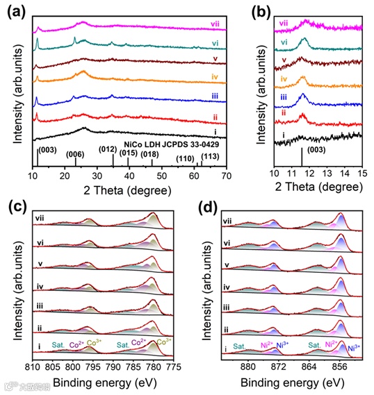 图2. 不同Al掺杂量NiCoAlx LDH电极的结构表征。a) XRD 图,及 b) 低角度区域中的放大部分。c) Ni 2p 和 d) Co 2p XPS 图。(i) NiCo LDH, (ii) NiCoAl0.05 LDH, (iii) NiCoAl0.1LDH, (iv) b-NiCoAl0.1LDH, (v) s-NiCoAl0.1LDH, (vi) NiCoAl0.2 LDH,(vii) NiCoAl0.4 LDH。