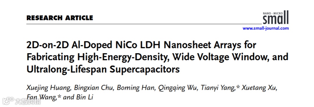 近日,来自广西大学的许雪棠教授、王凡教授和李斌教授团队,在国际知名期刊Small上发表题为“2D-on-2D Al-Doped NiCo LDH Nanosheet Arrays for Fabricating High-Energy-Density, Wide Voltage Window, and Ultralong-Lifespan Supercapacitors”的观点文章。该观点文章提出了采用交替的水热/溶剂热沉积策略,在碳布 (CC) 衬底上生长了一种新型的2D-on-2D铝掺杂镍基层状双氢氧化物(NiCoAlx LDH)纳米片阵列结构,并利用Al掺杂的影响来改变沉积行为、分层形貌、相稳定性和多金属协同效应。优化后的NiCoAl0.1 LDH电极及其组装的超级电容器件的电位窗口明显增大,且具有高比容量和优异的循环稳定性。