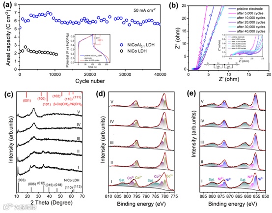 图4. 电极的循环性能。a) NiCo LDH和NiCoAl0.1LDH电极在50 mA‧cm−2下的循环稳定性测试。b) NiCoAl0.1LDH电极在不同循环周期下的阻抗图。c) NiCoAl0.1LDH电极在不同循环周期下的XRD图谱和d)Co2p和e)Ni2p XPS图:(i)5,000次循环后;(ii)在10,000次循环后;(iii)在20,000次循环后;(iv)在30,000次循环后;以及(v)在40,000次循环后。