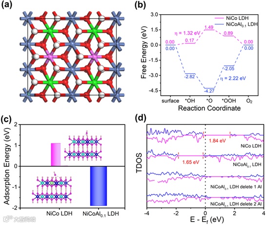 图 6 (a) NiCoAl0.1LDH的结构示意图; (b) NiCo LDH和 NiCoAl0.1LDH在OER过程中O 2p轨道自由能变化; (c) NiCo LDH和 NiCoAl0.1LDH对OH−离子的吸附自由能; (d) 循环过程中的总电子态密度变化。